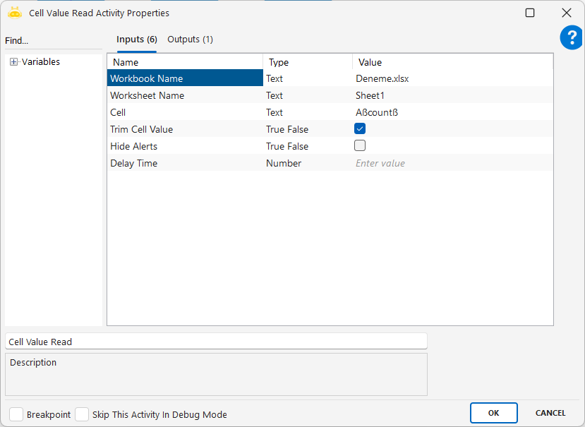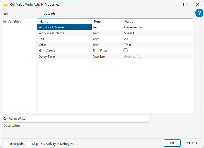 - Workbook Name: The name of the Excel file from which the values will be cut (e.g., Deneme.xlsx)