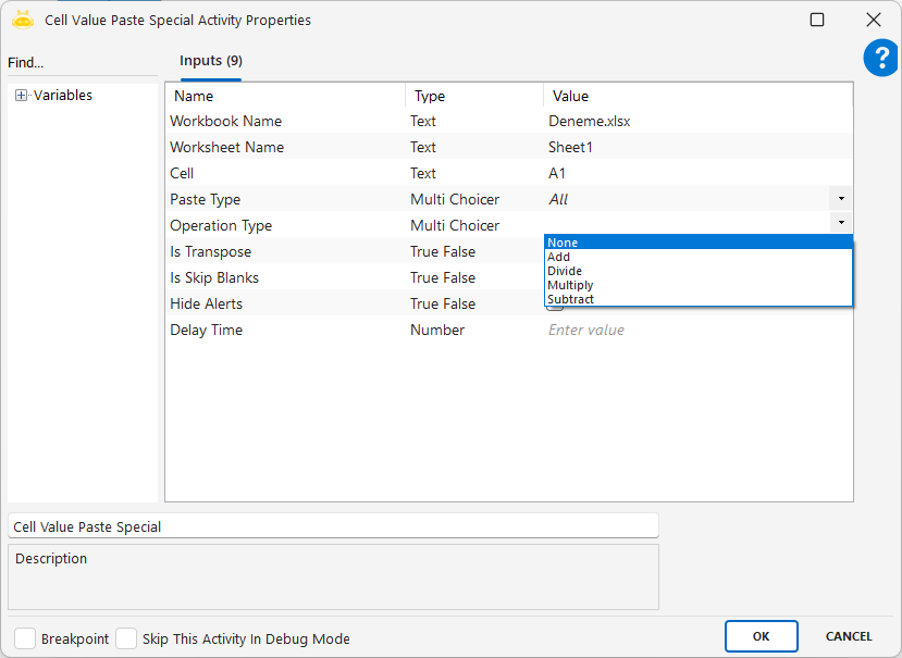 The Cell Value Paste activity is used to paste previously copied data into a specific cell in an Excel file. This activity allows data transfer while preserving both the content and structure. If needed, you can paste only the value of the copied cell, without transferring formulas or background links—resulting in static data.