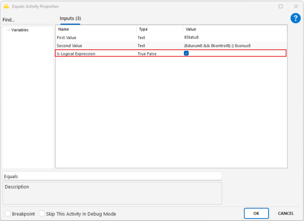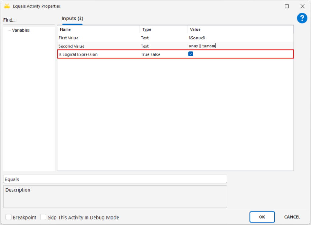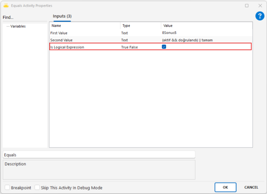 When the Is Logical Expression parameter is set to True in operator activities, the expression you write is interpreted not as plain text but as a logical structure. This allows you to define multiple conditions in a single line, specify alternative options, or use parentheses to clarify which conditions should be evaluated first. The two fundamental patterns below make it easier to understand how this logic works in operator activities.