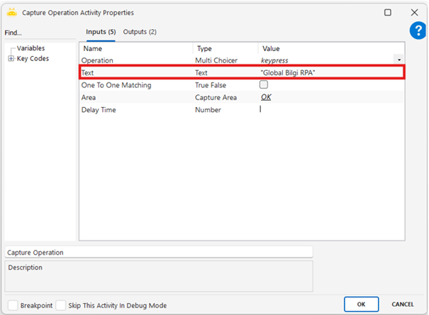 Capture Operation aktivitesi, ekran üzerindeki belirli bir bölgeyi ya da bir uygulama içindeki öğeyi (örneğin buton, ikon, metin kutusu) görsel kırpma yöntemiyle tanıyarak bu öğe üzerinde işlem yapılmasına olanak tanır. DOM yapısına erişilemeyen veya öğe ID’si gibi tanımlamaların kullanılamadığı durumlarda tercih edilir. Seçilen görsel öğe üzerinde tıklama (click, double click, right click, middle click), klavye girdisi gönderme (keypress) ve görselin varlığını kontrol etme (imageExist) gibi işlemler yapılabilir. Görsel yakalandığında sistem otomatik olarak bir eşleşme skoru hesaplar; bu skorun genellikle %80 ve üzerinde olması beklenir. Düşük eşleşme skorları robotun yanlış öğe üzerinde işlem yapmasına neden olabilir. imageExist komutu ile görselin varlığı kontrol edilerek işlem akışı koşula bağlanabilir ve hata riski azaltılabilir. Aktivitenin çalışabilmesi için ekranın açık, kilitli olmadan ve ilgili uygulamanın görünür olması gerekir. Görsel tanıma işlemi çözünürlüğe duyarlı olduğundan, ekran çözünürlüğü veya yerleşiminde yapılan değişiklikler eşleşme hatalarına neden olabilir. Bu nedenle sabit ekran ayarları tercih edilmeli ve görsel yakalanırken alanın net, sabit ve mümkün olduğunca küçük tutulmasına özen gösterilmelidir. Ayrıca, yalnızca geçerli görsellerin sistemde tanımlı kalmasını sağlamak için Capture ve Clear işlemleri doğru zamanda kullanılmalıdır.