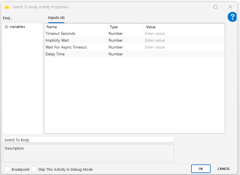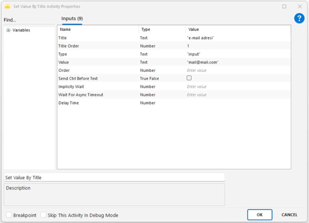 - Tab Id: işlemin yapılacağı tarayıcı sekmesini belirtir. Genellikle Attach Browser aktivitesinden alınır.