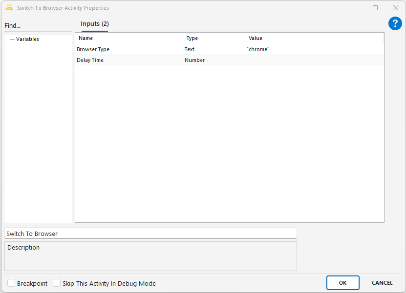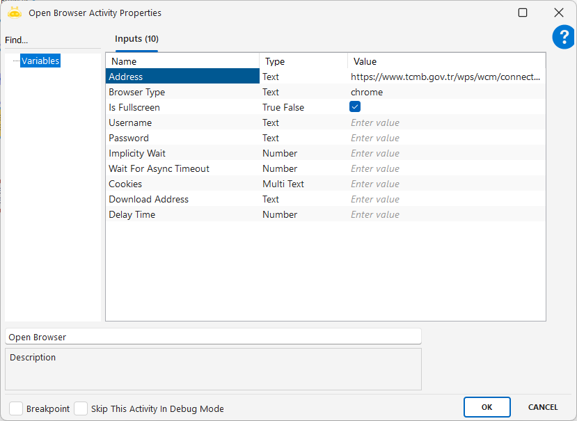 - Tab Id: Attach Browser aktivitesi tarafından sağlanan ve işlem yapılacak sekmeyi belirleyen değerdir. Bu değer, robotun hangi sekmede işlem yapacağını anlamasına yardımcı olur.