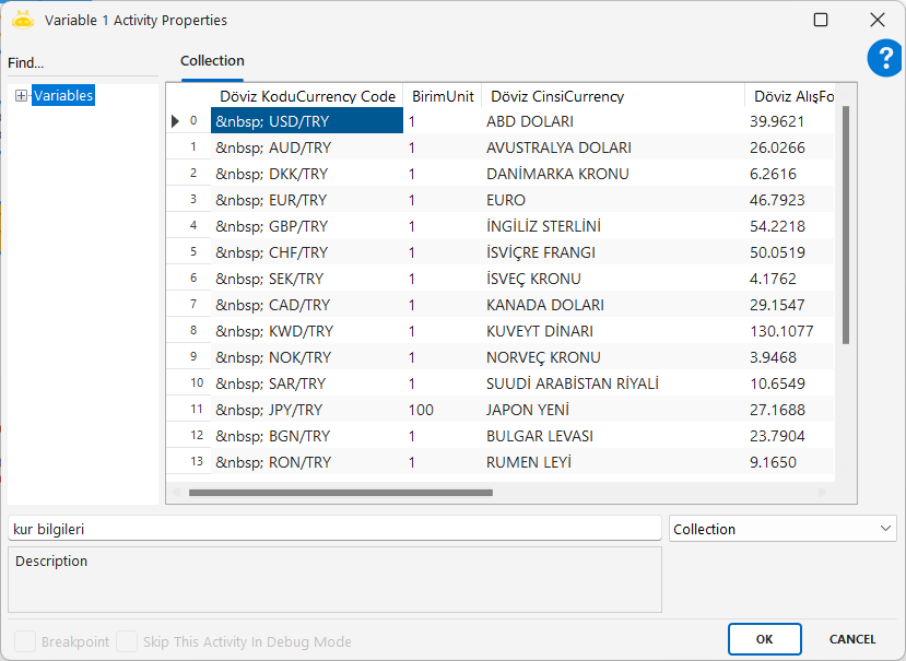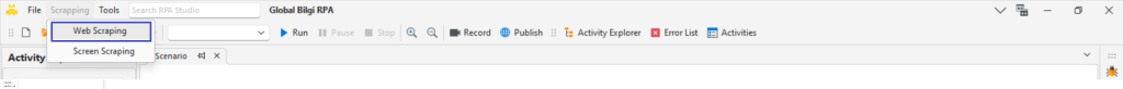 Web Scraping özelliğiyle, web siteleri üzerinde yer alan tabloları, sıralı metinleri vb. alanları tek bir seferde Collection türündeki değişkenlere aktarabilirsiniz. Studio ekranındaki “Web Scraping” butonuna tıklayarak Web Scraping sihirbazını çalıştırabilirsiniz.