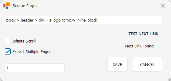 Web sitesindeki kayıtlar başka bir sayfadan devam ediyorsa buradaki kayıtları almak için “Next Page Settings” penceresinde tanımlamaları yapabilirsiniz. Penceredeki ilgili satıra, web sayfasındaki “Sonraki” butonunun “Selector” bilgisinin girilmesi gerekmektedir. “Test Next Link” butonu ile girilen Selector bilgisinin doğruluğunu test edebilirsiniz.