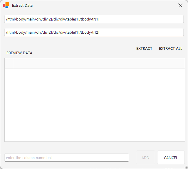 “Scrape Data” > “Extract” butonlarına sırasıyla tıkladıktan sonra açılan ekranda, tabloya ait iki adet sıralı satırın Xpath bilgisi ilgili alanlara girilir.