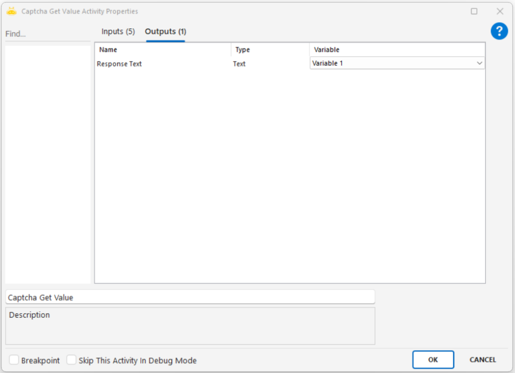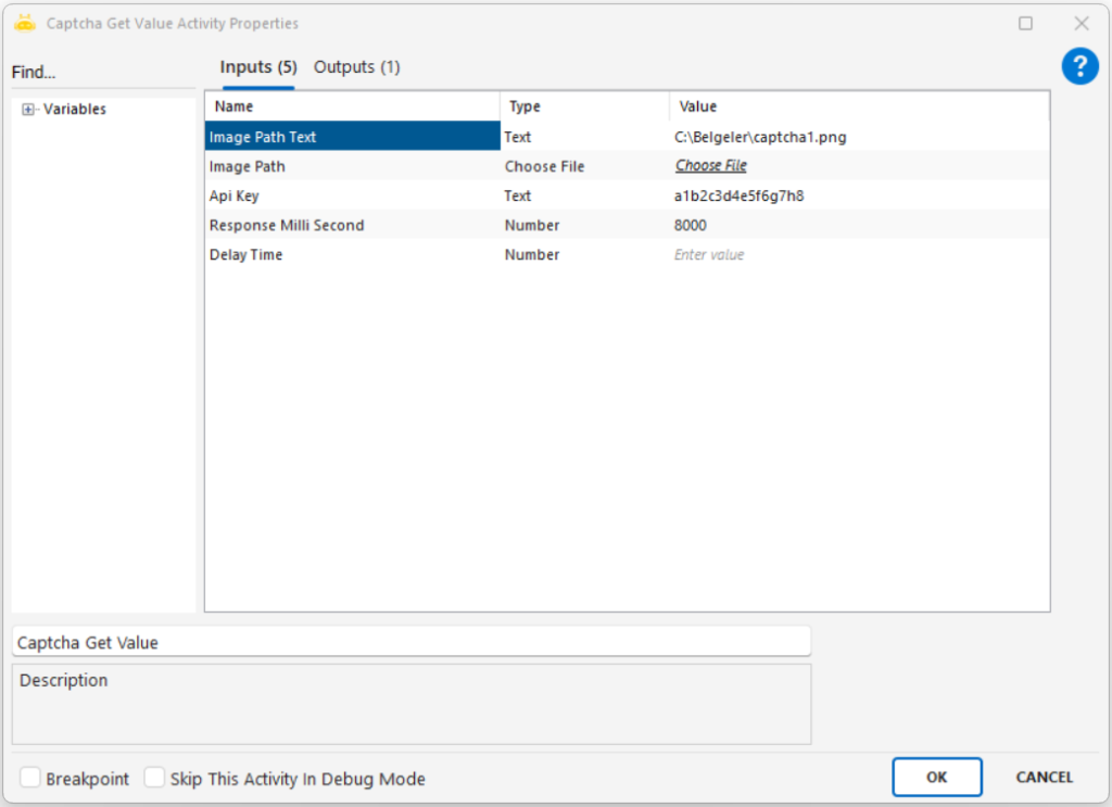 Bu aktivite, web sitelerinde insan ve bot ayrımını sağlamak için kullanılan CAPTCHA görsellerindeki metni çözümlemek amacıyla kullanılır. Görseldeki karmaşık karakterler, 2Captcha servisi aracılığıyla tanımlanır ve elde edilen sonuç bir değişkene aktarılır.