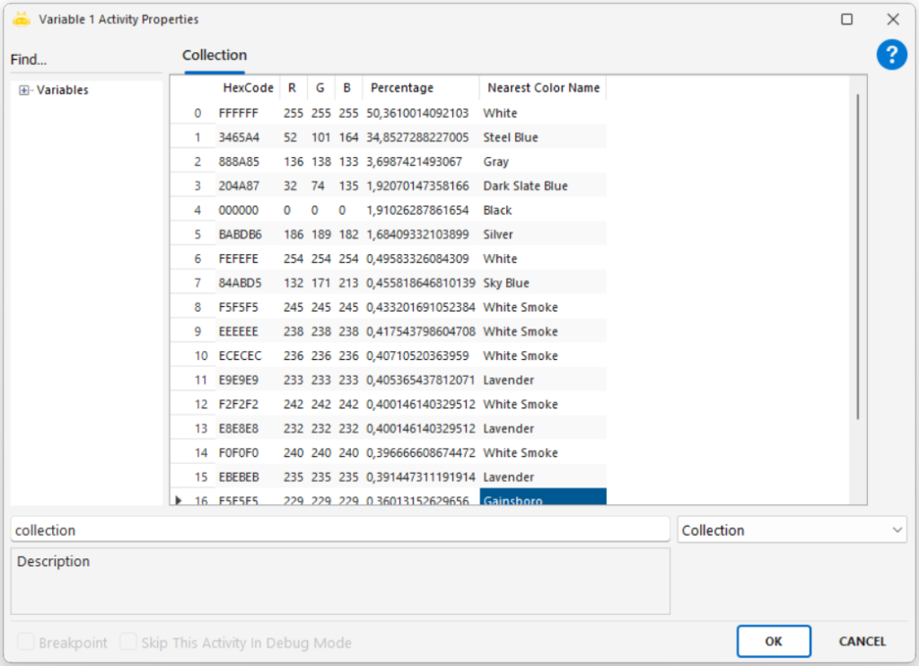 Bu aktivite, verilen bir görsel üzerinde bulunan renkleri analiz ederek, en çok kullanılan renkleri bir collection (liste) formatında değişkene aktarmak için kullanılır. Renk istatistiği çıkarmak, belirli renkleri filtrelemek veya renk ağırlıklı analiz yapmak için kullanılır.