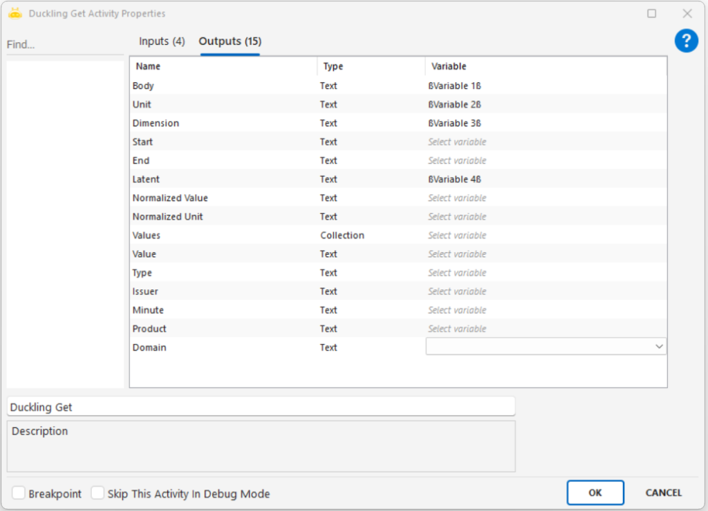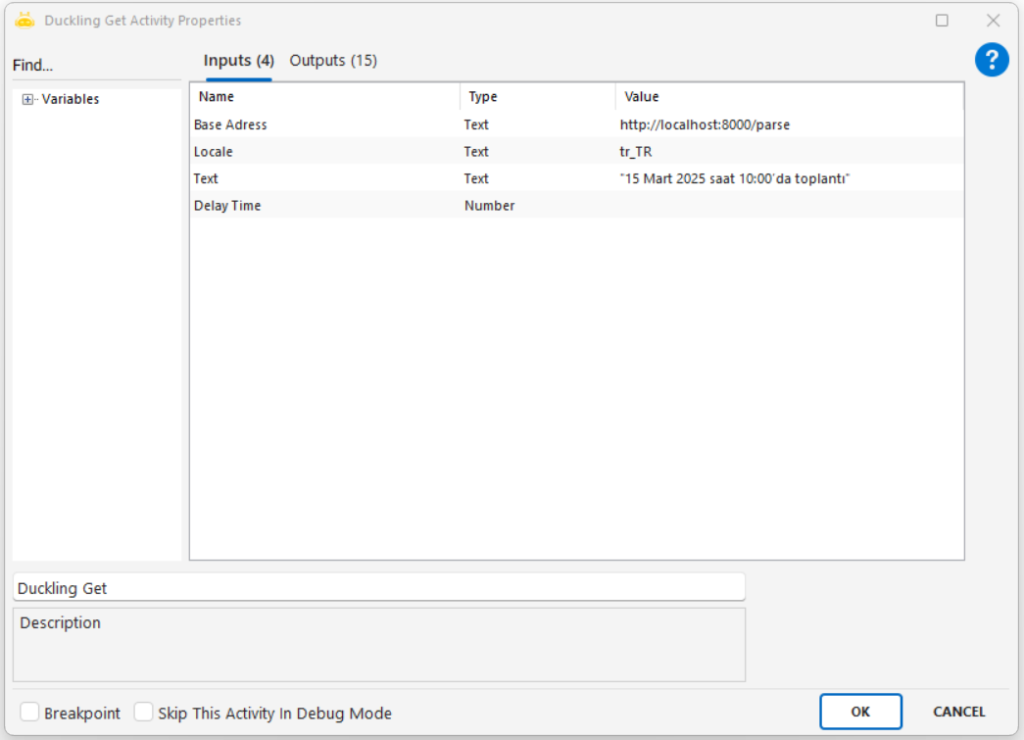 Bu aktivite, bir metin içindeki tarih, zaman, sayı, para birimi, ölçü birimi, miktar, süre gibi anlamlı ifadeleri tanır ve yapılandırılmış verilere dönüştürür. Duckling, doğal dil işleme (NLP) için kullanılan bir açık kaynak aracıdır.