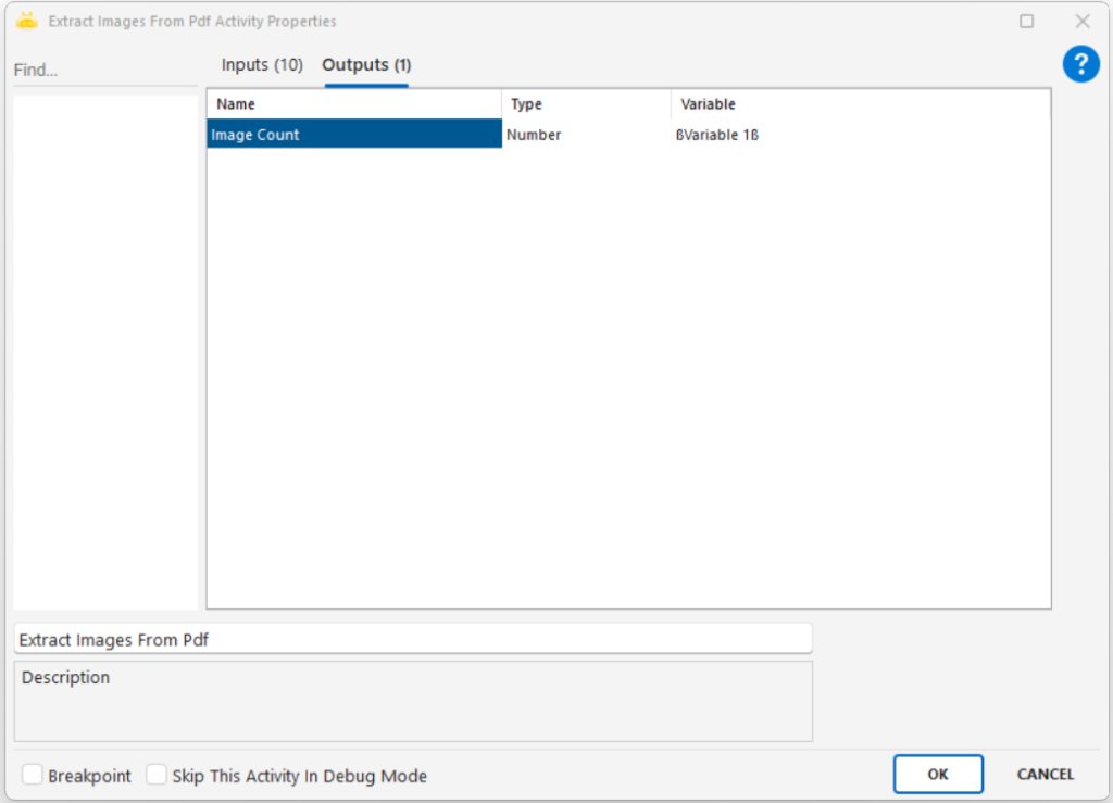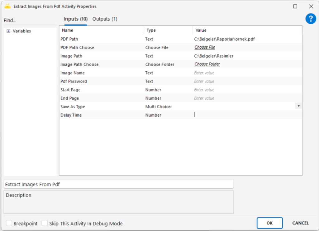 Bu aktivite, bir PDF dosyası içerisindeki gömülü resimleri çıkartarak, belirlenen hedef klasöre istenen formatta kaydetmek için kullanılır. Ayrıca, çıkartılan toplam resim sayısı da output üzerinden alınabilir ve süreçte kullanılabilir.