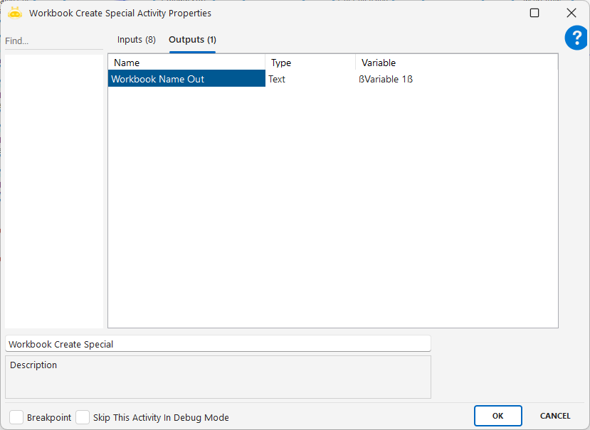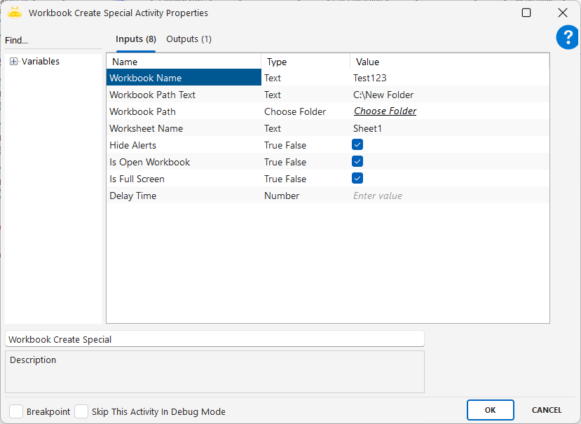 Workbook Create Special aktivitesiyle, istediğiniz herhangi bir hedefe, istediğiniz isimde yeni bir excel dosyası oluşturabilirsiniz. Workbook Create aktivitesinden farklı olarak kaydetmek istediğiniz hedef ve isim bilgisini önceden belirleyebilirsiniz.