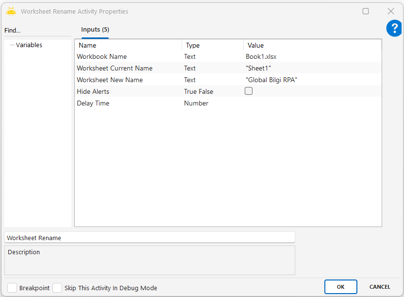 - Worksheet New Name: Çalışma sayfasına verilecek yeni isimdir.Örnek: Global Bilgi RPA