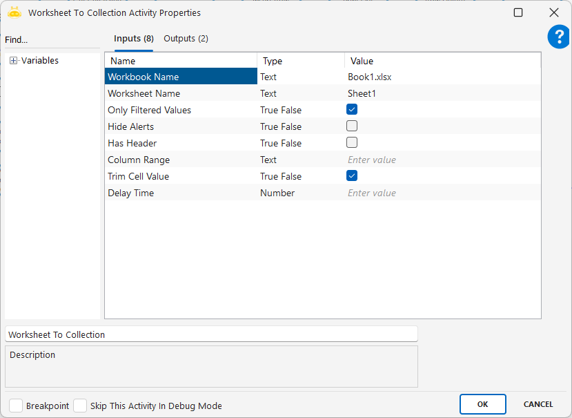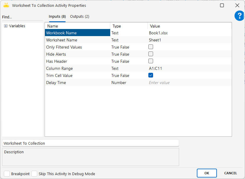 Worksheet To Collection aktivitesi, bir Excel çalışma sayfasındaki hücre verilerini tablo (collection) formatında bir değişkene aktarmak için kullanılır. Bu sayede her bir hücreye ayrı ayrı erişmek yerine, tüm tabloyu tek seferde okuyarak veriye kolayca erişim sağlanır. Özellikle veri tablosu yapısında saklanan bilgileri işlemeye başlamadan önce topluca almak için idealdir.