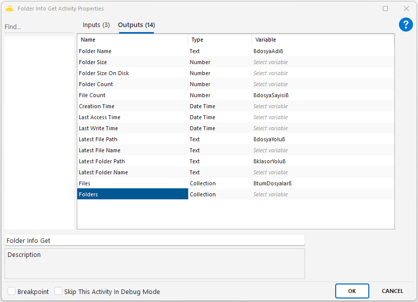 Folder Info Get aktivitesi, belirtilen klasörün içeriği hakkında detaylı bilgi edinmek için kullanılır. Klasörün boyutu, içindeki dosya ve klasör sayısı, en son erişilen ya da yazılan dosya bilgileri gibi çok sayıda çıktı sağlar.