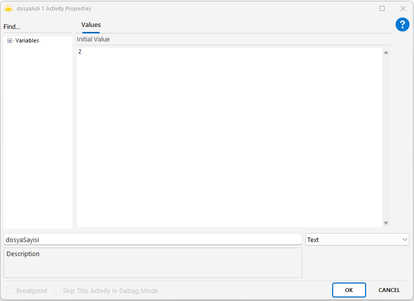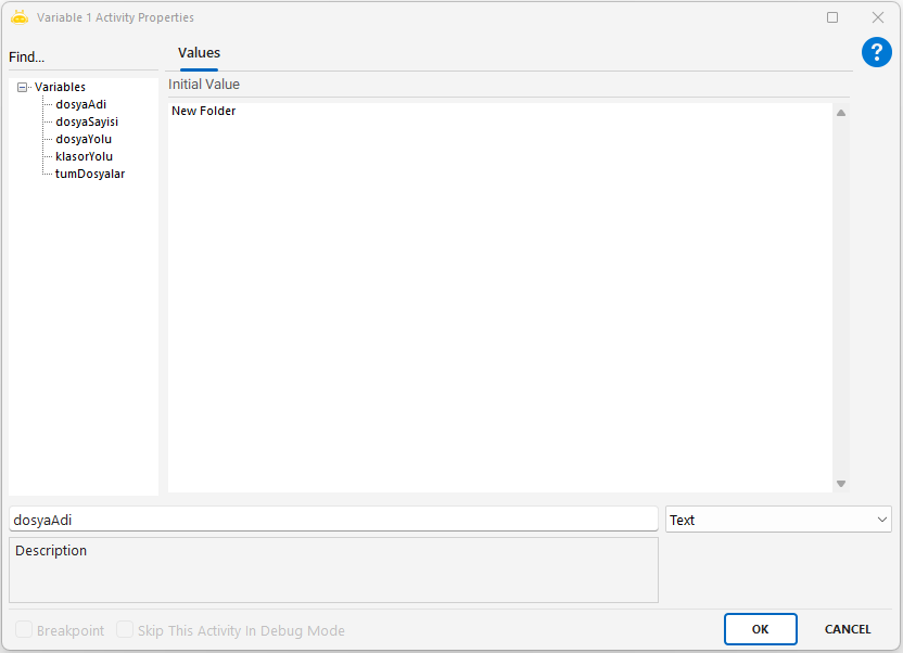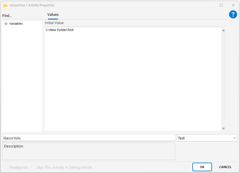File Create Text aktivitesi, sistem üzerinde yeni bir metin dosyası (.txt, .docx vb.) oluşturmak için kullanılır. Dosya yolu ve adı belirtilerek oluşturma işlemi yapılır.