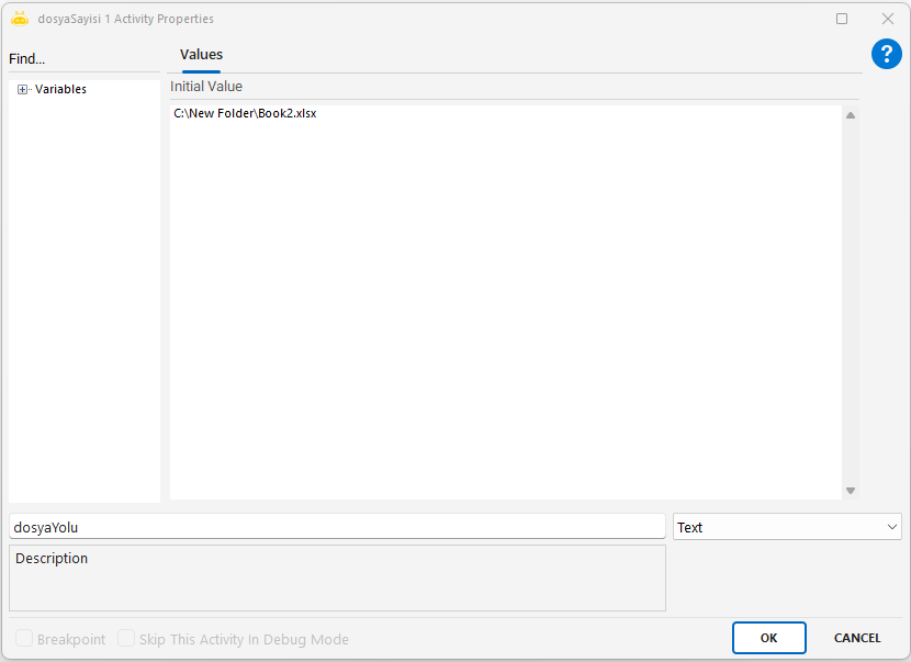 - Varlık kontrolü, bir çıktı değişkenine True veya False olarak aktarılmalıdır (bu, aktivite tanımının görselde yer almayan Outputs sekmesinde ayarlanır)
