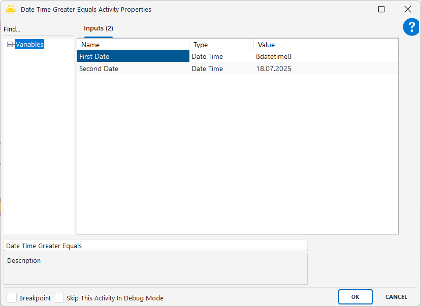 - First Date : Karşılaştırılacak ilk tarih ya da tarih-saat bilgisidir. Bu değer genellikle bir değişken (örneğin: @Variable18) olarak sistemden veya önceki bir adımdan alınır.