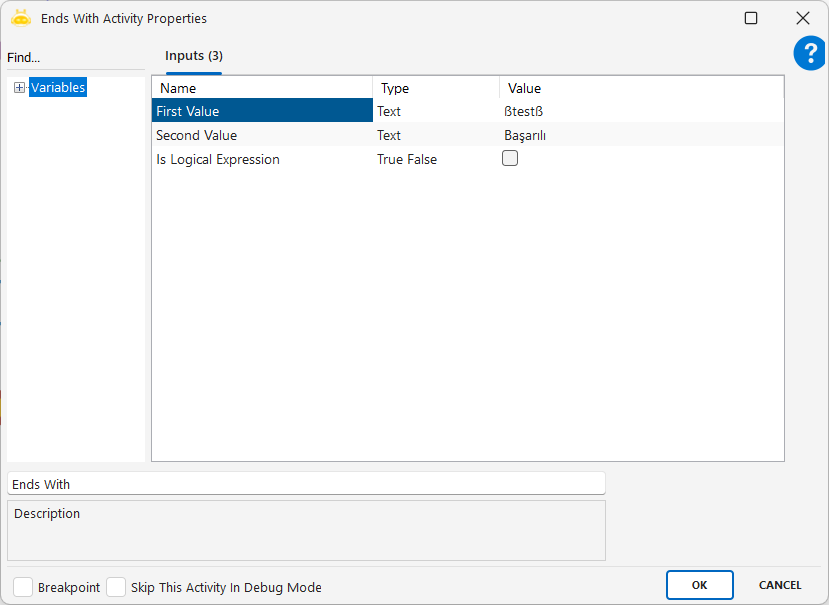 - @Variable18 = “Durum” ve Second Value = “DURUM” → sonuç False (büyük/küçük harf farkı)