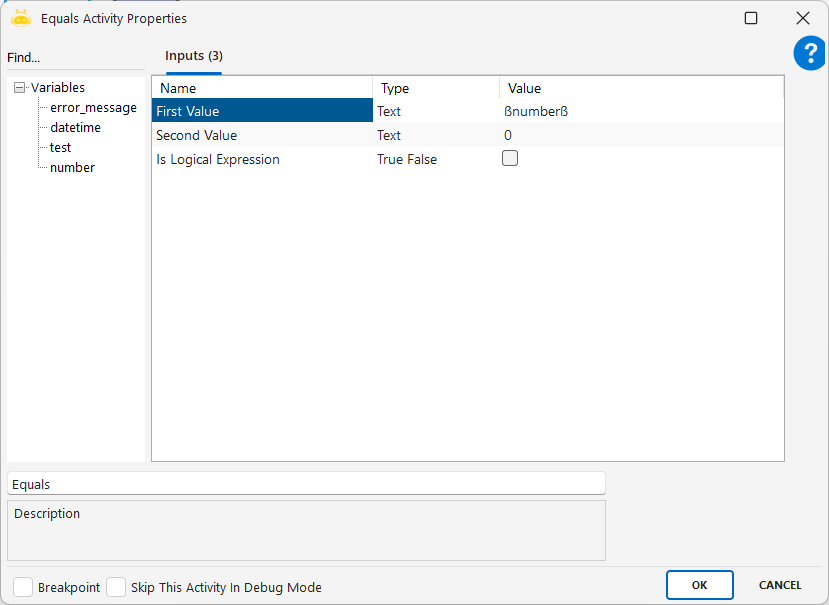 - First Value: Karşılaştırılacak birinci değerdir. Genellikle bir değişken ya da sabit değer olarak girilir.Örnek: @Variable18