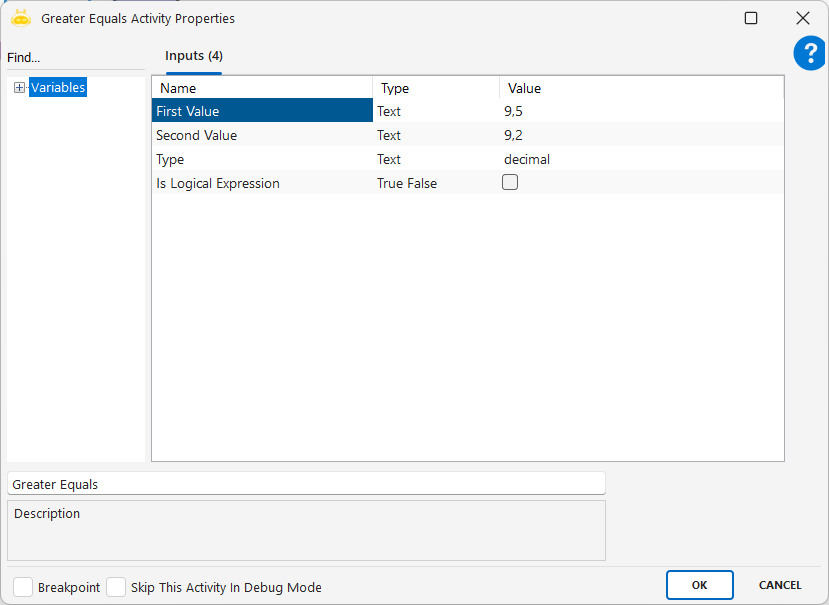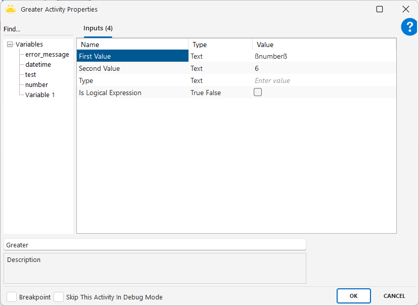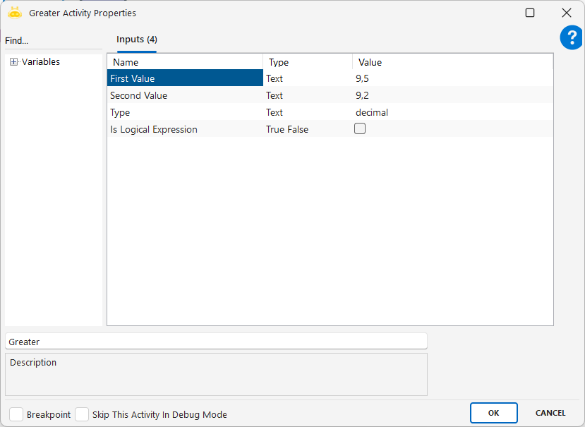 - @Variable18 = “7” ve Second Value = “5” ise, sonuç True döner çünkü 7 > 5.