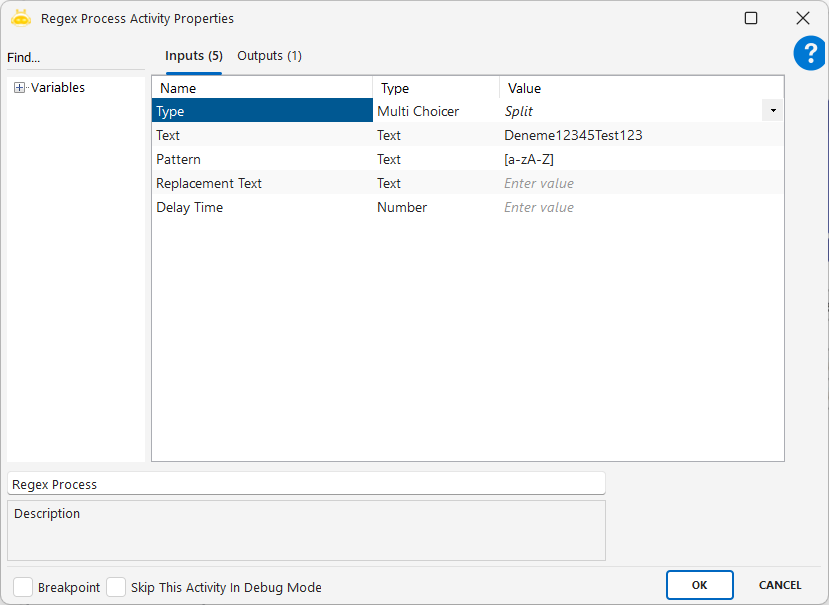 - Split: Girilen metinden, yazılan regex ifadesiyle eşleşen verileri seperatör olarak kullanıp parçalama işlemi yapar.Örneğin, [a-zA-Z] regex ifadesi a ve z arasındaki, karakterleri tek tek seçer. Input olarak girilen metni bu ifadeye göre parçalar ve sonuçları output olarak verir.