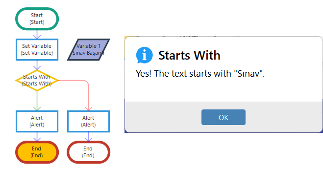 Örnek: “Sınav Başarılı” değeri “Sınav” ile başlıyorsa sonuç True, “Başarılı” gibi başka bir kelimeyle başlıyorsa sonuç False döner.