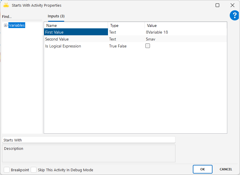 - First Value: Başlangıcı kontrol edilecek kaynak metin ya da metin değişkenidir.Örnek: @Variable18