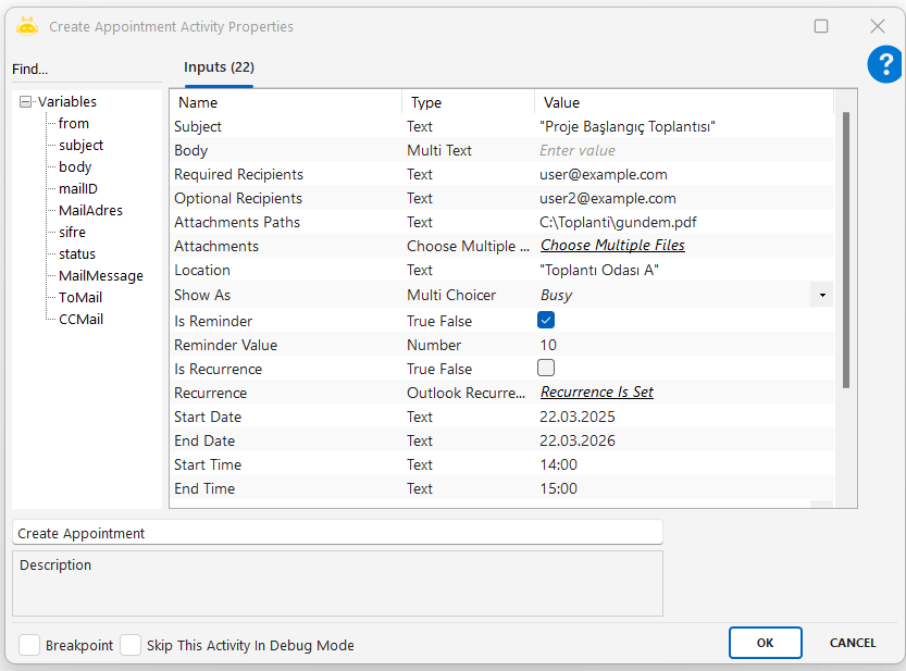 Create Appointment Aktivitesi, takvim üzerinde toplantı veya etkinlik oluşturmak için kullanılır. Bu aktivite; tarih, saat, konu, katılımcılar, ekler ve hatırlatıcı gibi birçok özelliği destekleyerek Outlook takvimiyle senkronize bir randevu oluşturmanıza olanak tanır. Tek seferlik veya tekrarlayan etkinlikler oluşturulabilir.