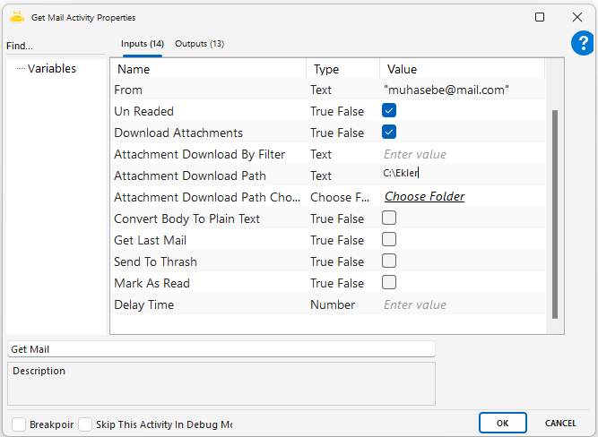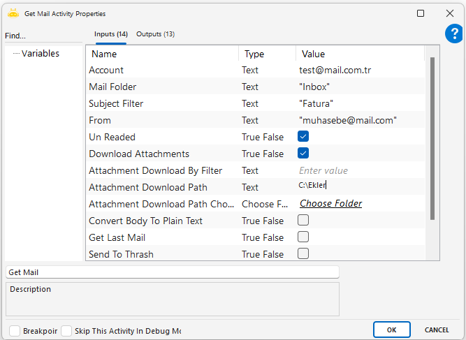 • Get Mail aktivitesi, e-posta kutusundan alınan bilgileri çeşitli değişkenler aracılığıyla çıktı olarak sağlar. Bu çıktılar; e-postanın kimden geldiği (Sender), kime gönderildiği (To, Cc, Bcc), konu başlığı (Subject), içeriği (Body), gönderim tarihi ve saati (Date, Time), eğer varsa indirilen ek dosya yolları (DownloadedAttachmentPaths) ve e-postaya ait benzersiz kimlik (MailId) gibi kritik bilgileri içerir. Bu bilgiler otomasyon süreçlerinde analiz, kayıt veya yönlendirme gibi işlemlerde kullanılmak üzere kolayca işlenebilir.