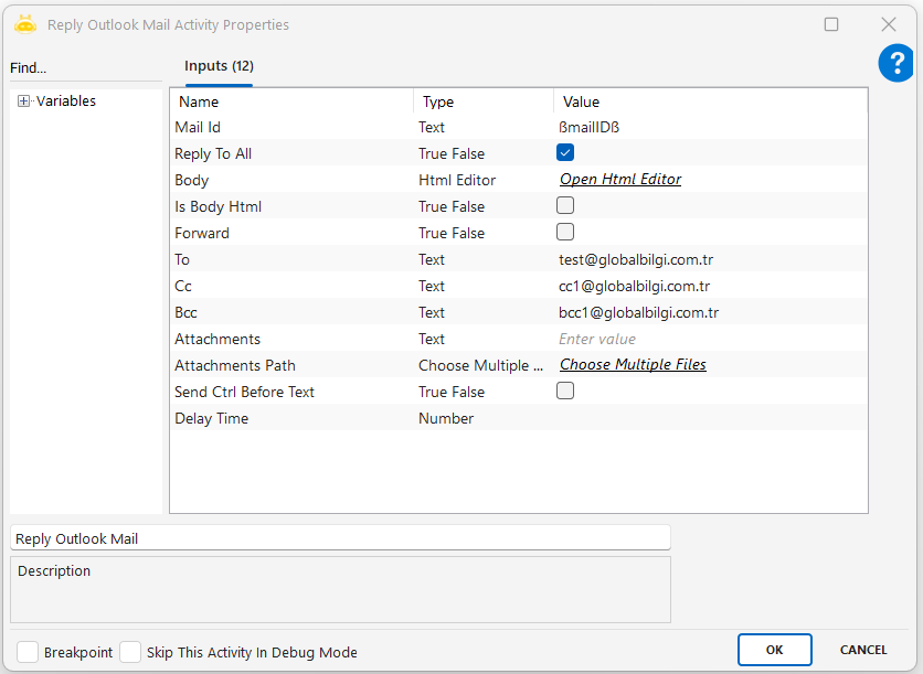 Reply Outlook Mail Aktivitesi, Outlook üzerinden alınan bir e-postaya yanıt vermek için kullanılır. Bu aktivite sayesinde belirli bir Mail ID’ye sahip e-postaya, belirlenen içerik ve alıcılara otomatik olarak yanıt verilebilir. Yanıt içeriği düz metin ya da HTML olabilir; ayrıca To, Cc ve Bcc alanlarına alıcılar eklenebilir ve yanıtla-tümüne seçeneği kullanılabilir. Gerekirse dosya ekleri de yanıtla birlikte gönderilebilir.