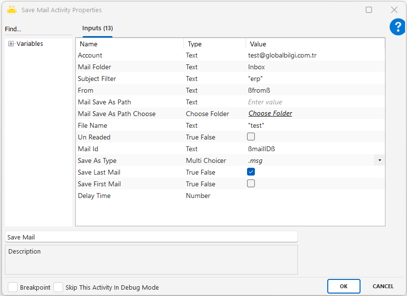 Save Mail Aktivitesi, Outlook hesabındaki e-postaları belirli kriterlere göre filtreleyip .txt, .html veya .msg formatlarında dosya olarak kaydetmek için kullanılır. E-postalar konu, gönderen, klasör, okunmamış olma gibi filtrelerle hedeflenebilir. Kaydedilecek dosyanın adı, kayıt yeri ve ilk/son e-posta seçimi gibi parametreler özelleştirilebilir.