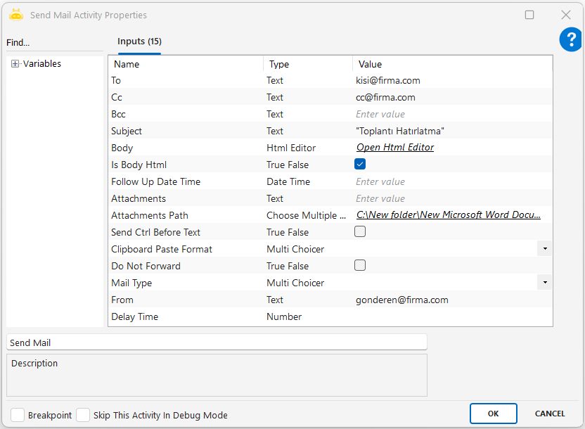 Send Mail, belirlenen alıcılara Outlook üzerinden e-posta göndermek için kullanılır. Aktivite içerisinde konu, içerik, alıcılar (To, Cc, Bcc), HTML body, ek dosyalar gibi tüm alanlar özelleştirilebilir. Ayrıca, e-postanın yönlendirilmesini engelleme ve gönderim öncesi Ctrl tetikleme gibi gelişmiş özellikleri de içerir.