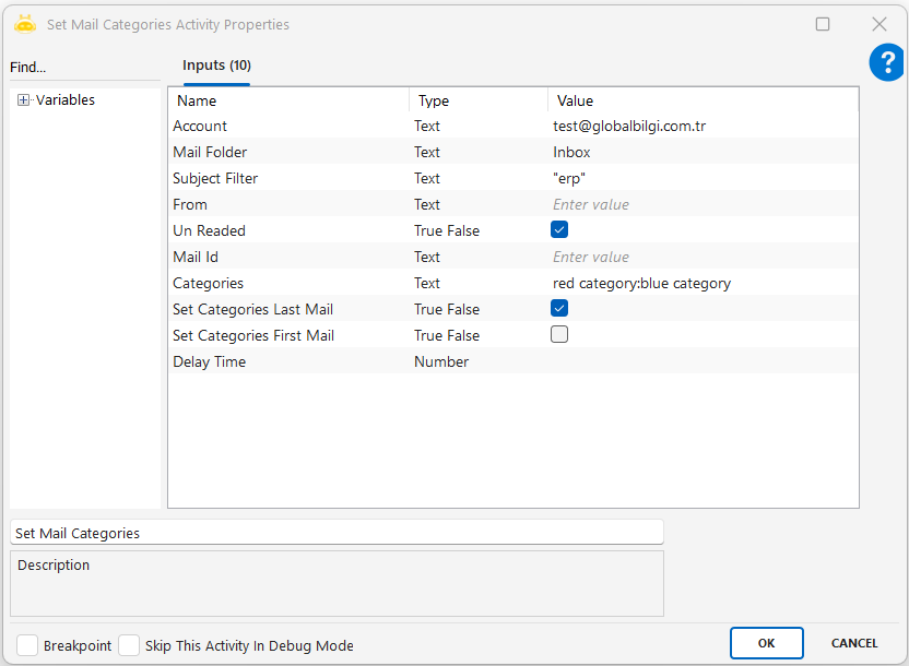 Set Mail Categories aktivitesi, Outlook içerisindeki bir veya birden fazla e-postaya belirli kategori etiketleri atamak için kullanılır. Kategoriler, e-postaların daha sonra kolayca filtrelenmesini, gruplanmasını veya görsel olarak ayırt edilmesini sağlar. Bu aktivite ile belirli filtrelere göre bulunan mailler kategorilendirilebilir.