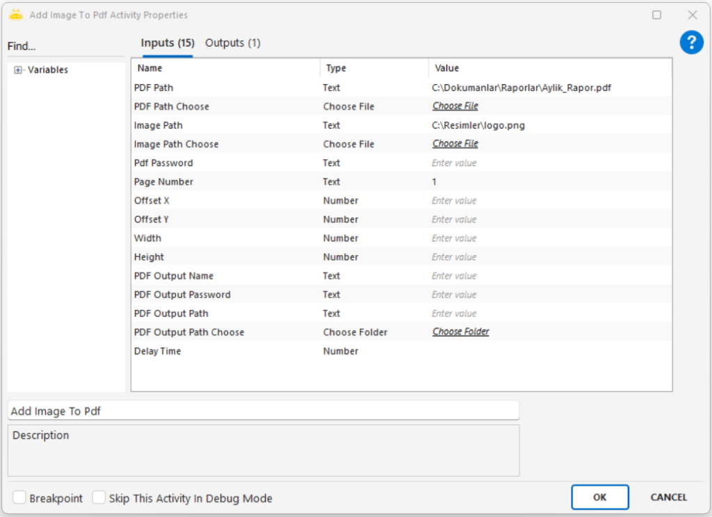 Add Image To Pdf Aktivitesi; Bu aktivite ile bir pdf dosyasında belirtilen sayfalara resim ekleme işlemi gerçekleştirebilirsiniz.