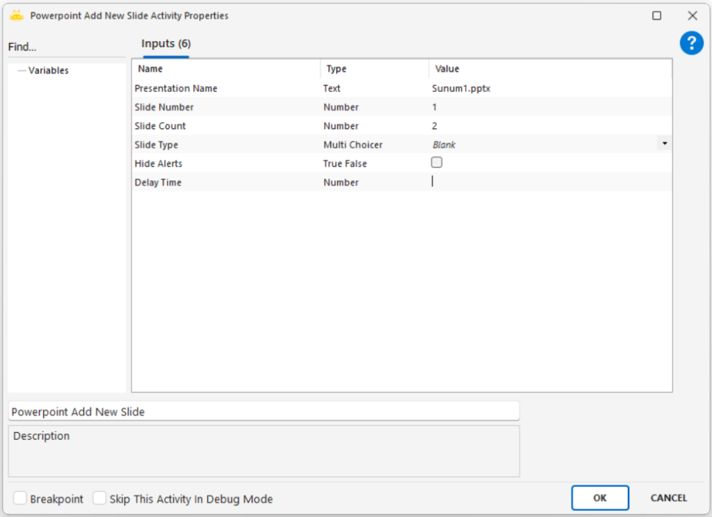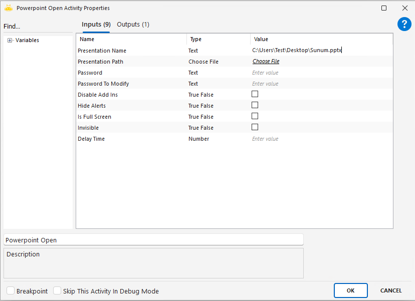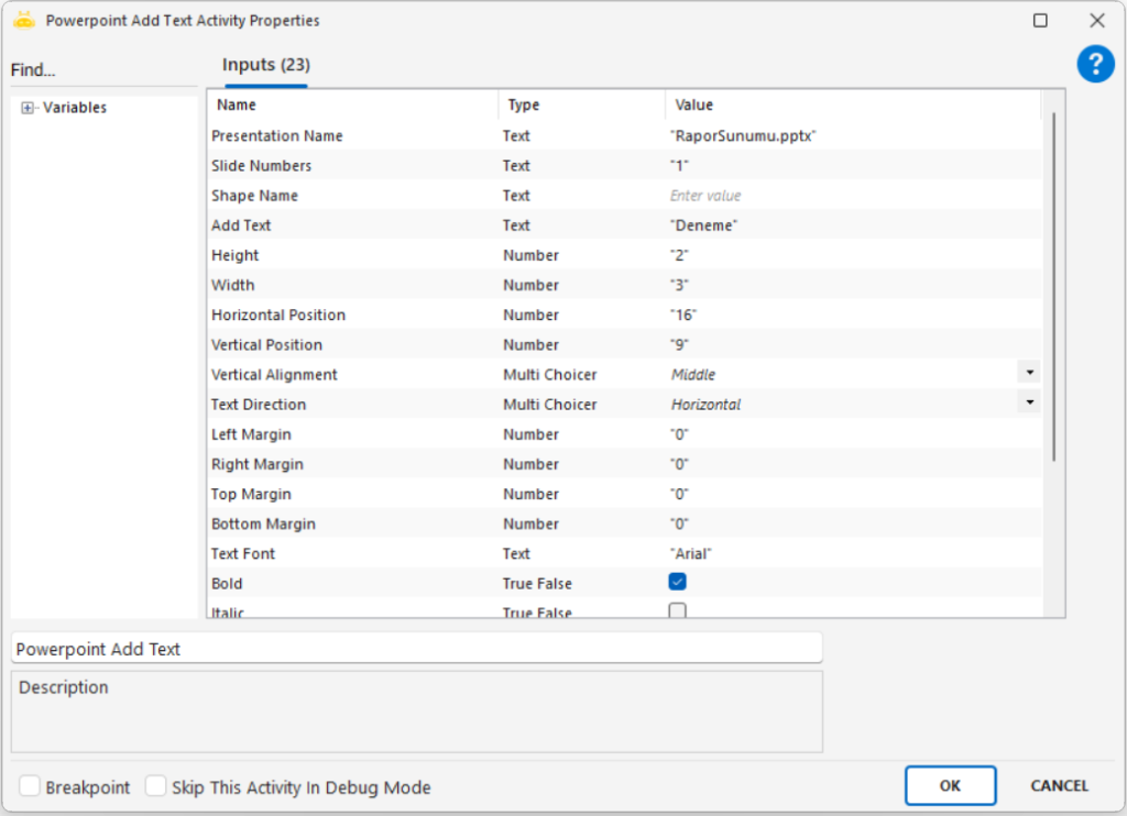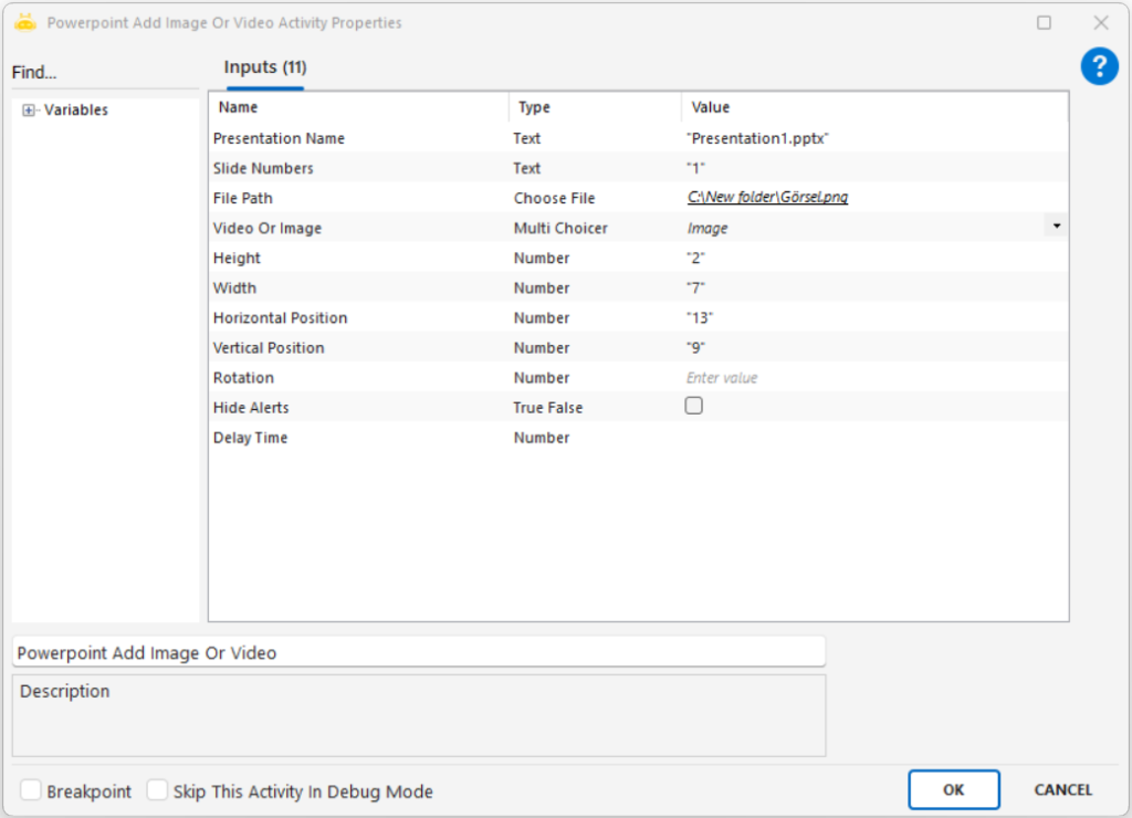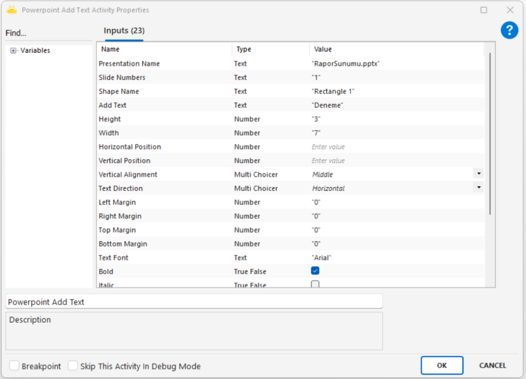 - Presentation Name: Üzerinde işlem yapılacak PowerPoint dosyasının adı (örn: “Presentation1.pptx”)