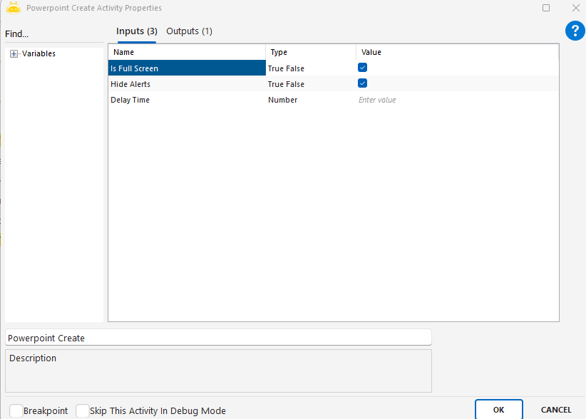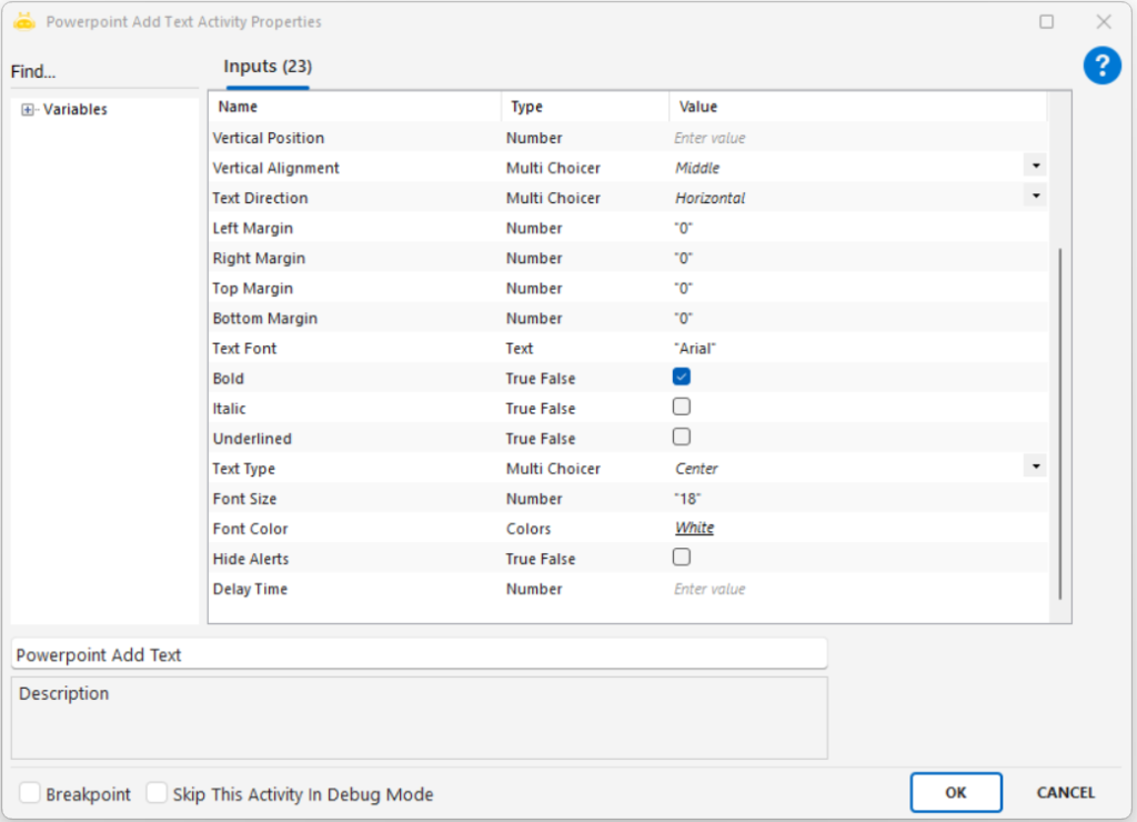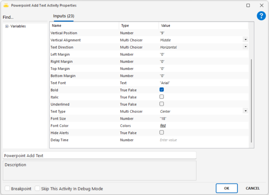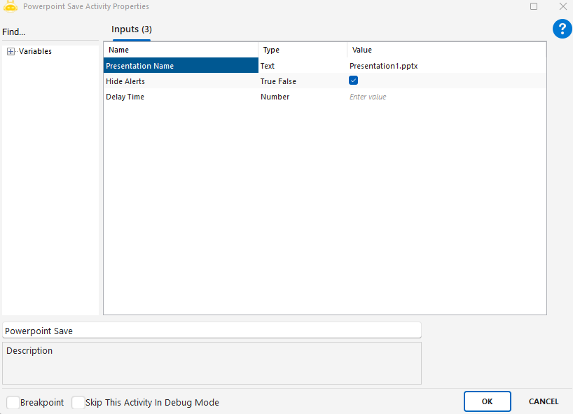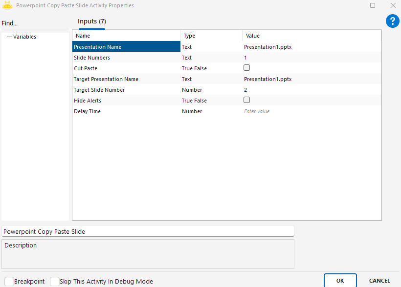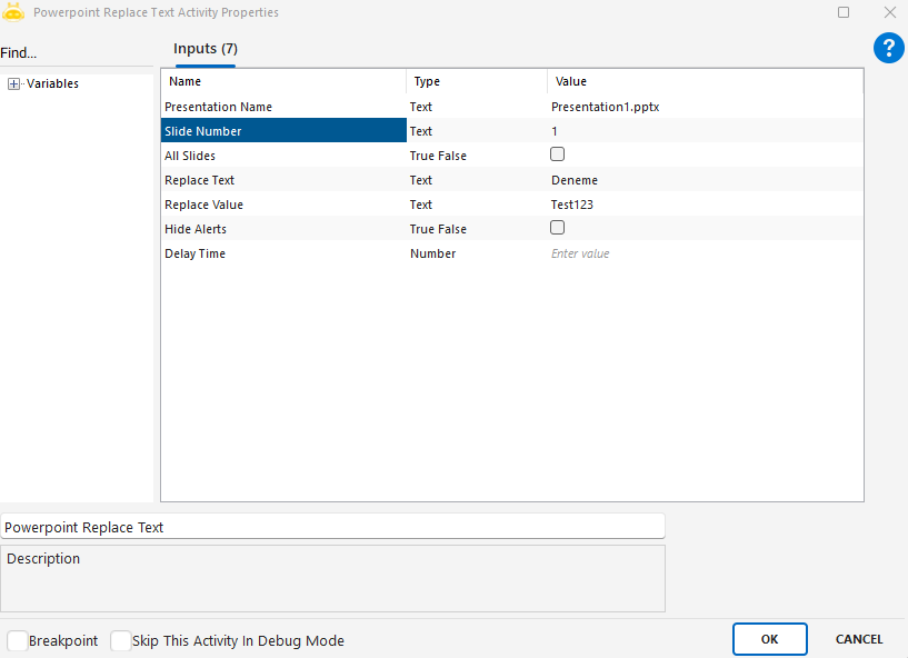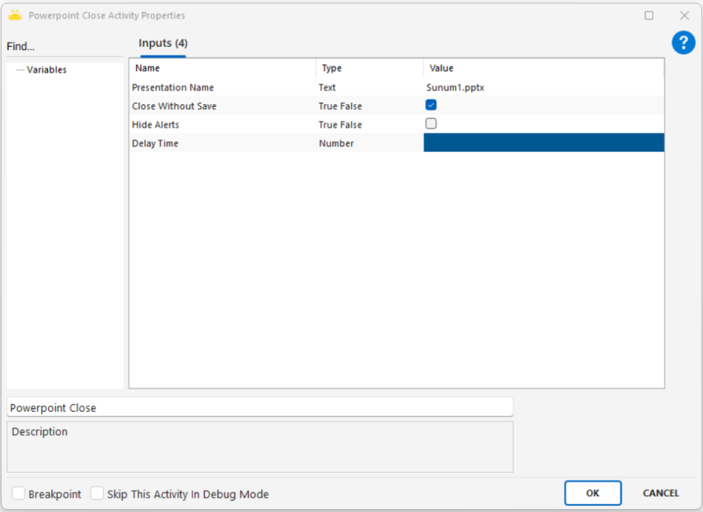- Presentation Name: Üzerinde işlem yapılacak PowerPoint dosyasının adı (örn: “Presentation1.pptx”)