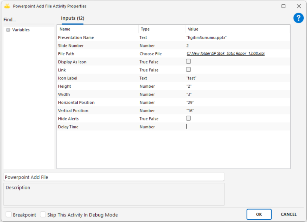 - Slide Number: Dosyanın ekleneceği slayt numarasını belirler (örn: “1”)