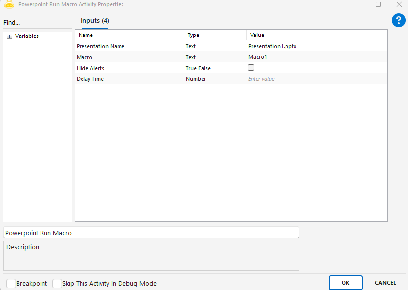 - Presentation Name: Makronun çalıştırılacağı PowerPoint dosyasının adı (örn: “Presentation1.pptx”)