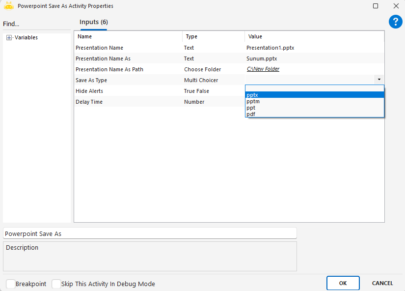 - Presentation Name As Path: Yeni dosyanın kaydedileceği klasör (örn: “C:\New folder”)