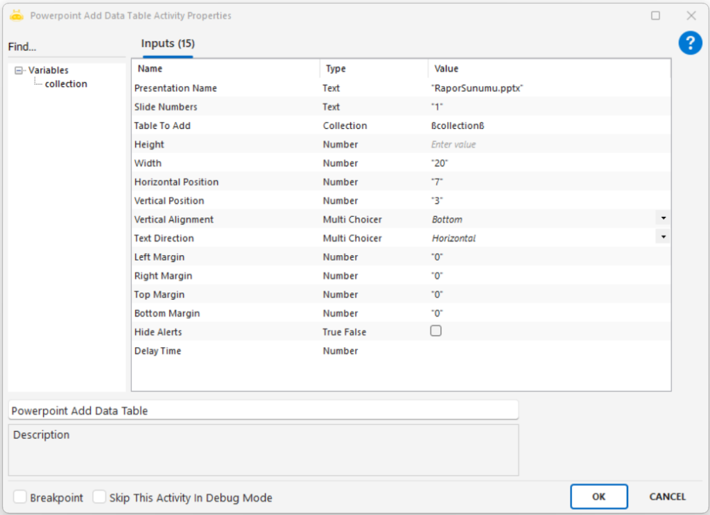 PowerPoint sunumuna, belirli bir slayta Collection türünde veri tablosu eklemek için kullanılır. Eklenen tablonun boyutları, hizalama seçenekleri ve slayt üzerindeki konumu bu aktivite ile detaylı şekilde ayarlanabilir.