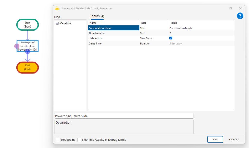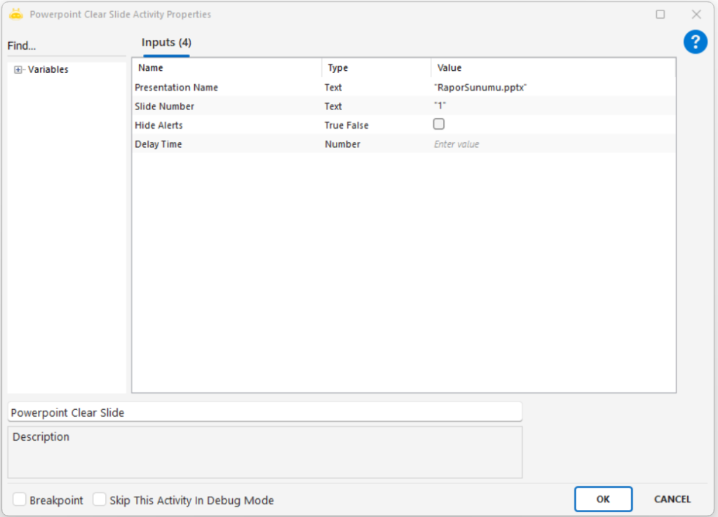 - Presentation Name: Slaytı silinecek PowerPoint dosyasının adı (örn: “Presentation1.pptx”)