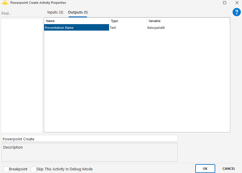 Yeni bir PowerPoint sunumu oluşturmak için kullanılır. Oluşturulan sunum adı bir değişkene aktarılabilir ve senaryo içinde sonraki adımlarda kullanılabilir.