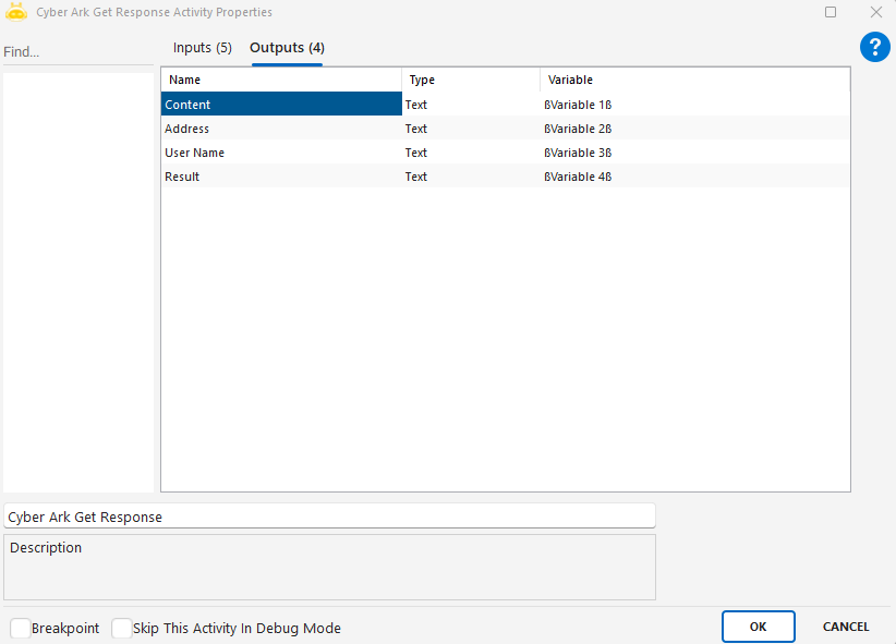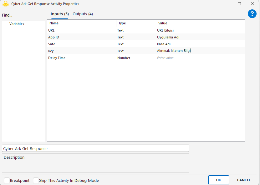Cyber Ark Get Response aktivitesi, CyberArk üzerinde güvenli şekilde saklanan şifreli bilgilere erişim sağlamak amacıyla kullanılır. Bu aktivite sayesinde, senaryonuz içerisinde veritabanı şifreleri, kullanıcı adları veya bağlantı adresleri gibi hassas bilgileri dinamik olarak çekebilir ve güvenli bir şekilde kullanabilirsiniz.