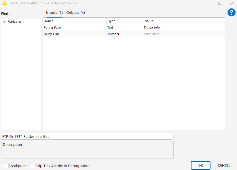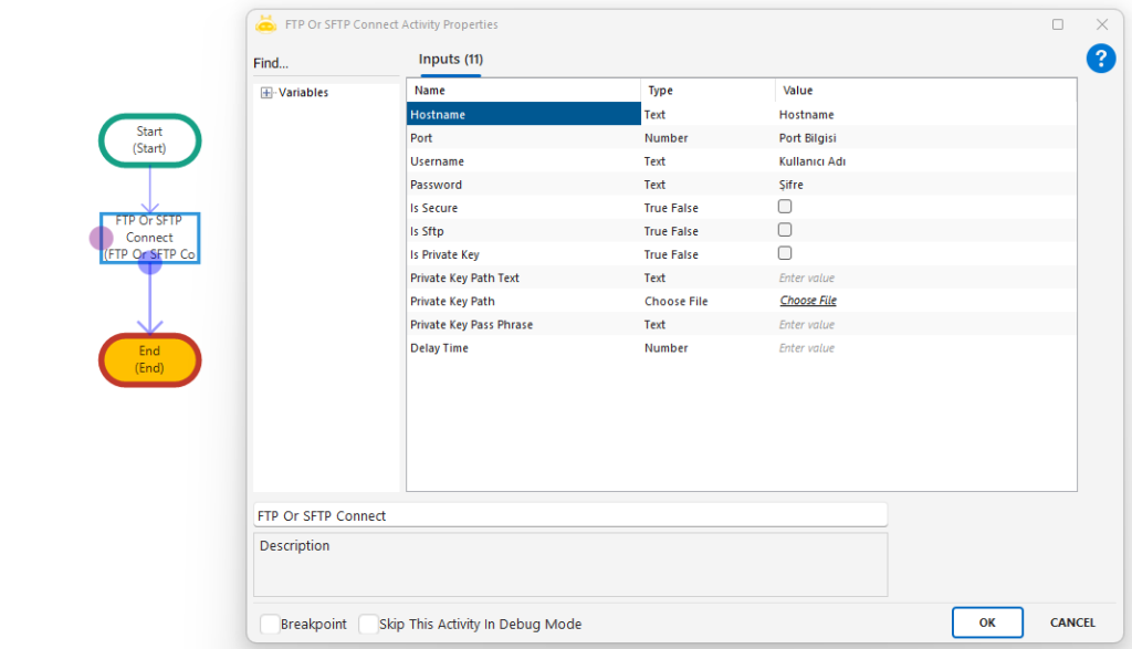 Not: Bu aktivite, senaryo içerisinde yapılacak klasör değiştirme, dosya listeleme, dosya indirme/yükleme gibi işlemlerden önce kullanılmalıdır. Kurulan bağlantı, diğer FTP/SFTP aktiviteleri tarafından otomatik olarak kullanılır.
