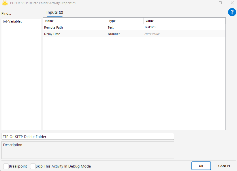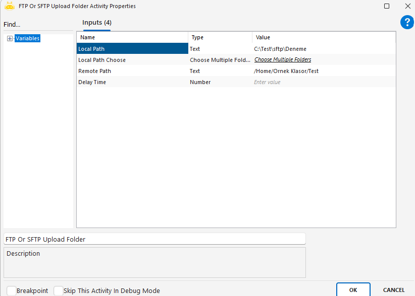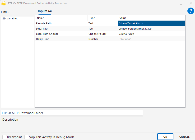 FTP Or SFTP Delete Folder aktivitesi, FTP veya SFTP bağlantısı üzerinden varsayılan (aktif) dizin içinde bulunan bir klasörü silmek için kullanılır. Bu aktivite, uzak sunucuda kullanılmayan klasörlerin kaldırılması gibi senaryolarda tercih edilir.