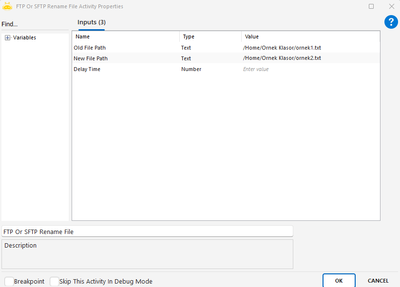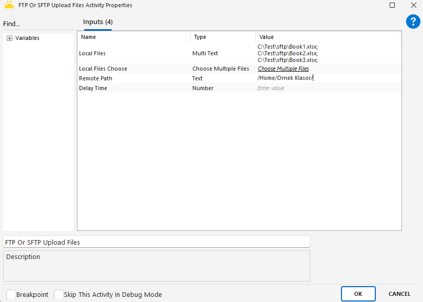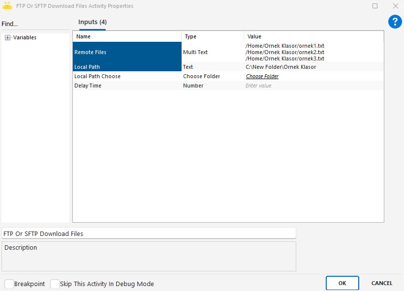 FTP Or SFTP Delete Files aktivitesi, bir FTP ya da SFTP sunucusuna bağlandıktan sonra, aktif (varsayılan) dizinde bulunan belirli dosyaları silmek için kullanılır. Bu aktivite, uzak sunucularda yer açmak, eski verileri kaldırmak veya periyodik temizlik işlemleri için kullanılır.