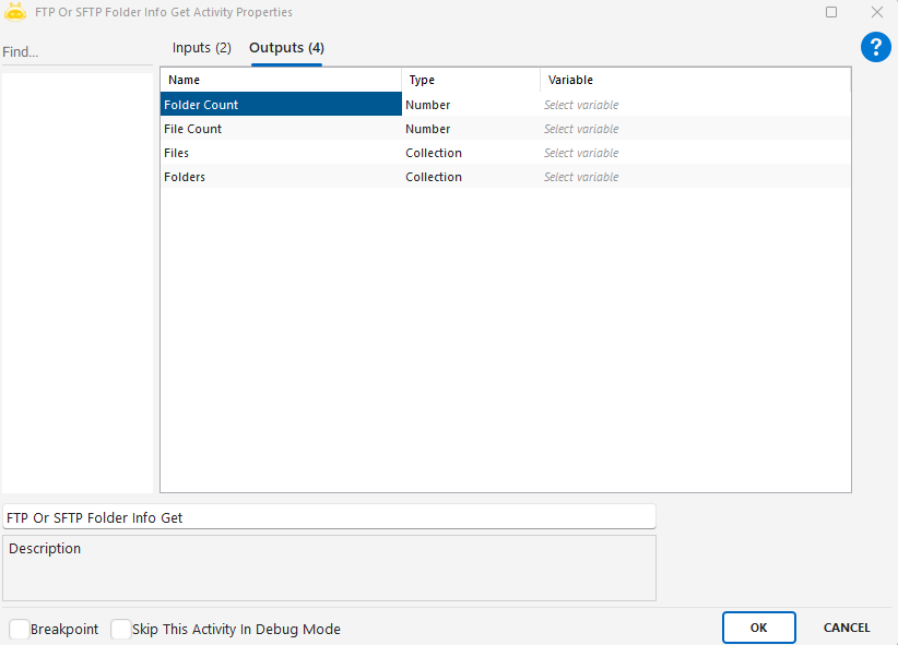 - Aktif bağlantının daha önce FTP Or SFTP Connect aktivitesi ile kurulmuş olması gerekir.