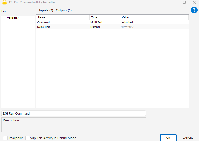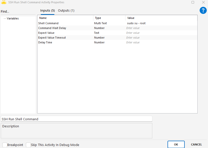 - Bu aktivite kullanılmadan önce SSH Connect aktivitesi ile bağlantı kurulmuş olmalıdır.