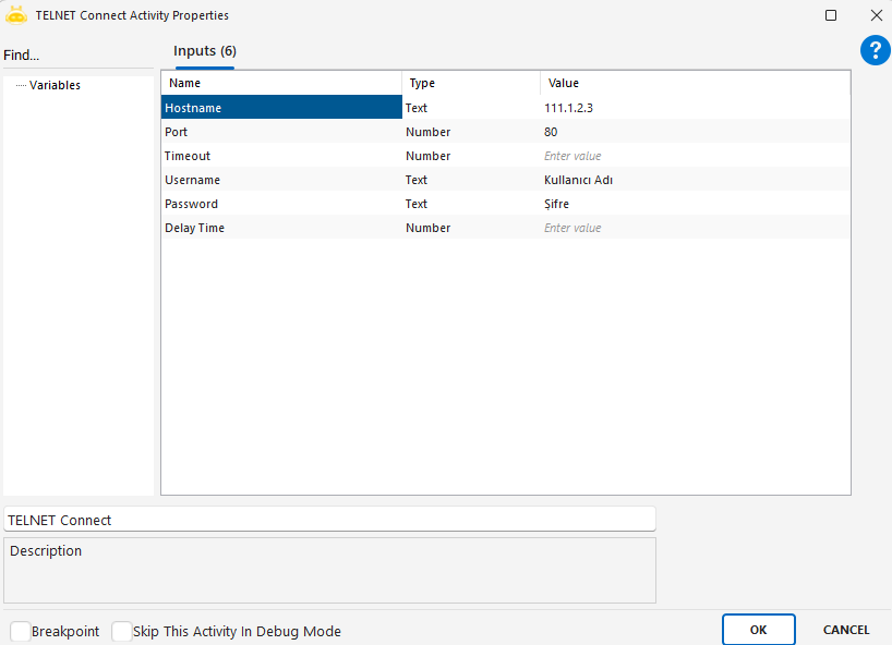 - Bağlantı başarılı olduktan sonra komut çalıştırmak için TELNET Run Command aktivitesi kullanılır.