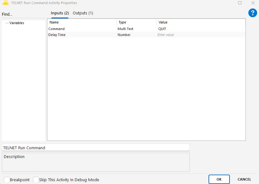 TELNET Run Command aktivitesi, TELNET ile bağlantı kurulduktan sonra komut çalıştırmak için kullanılmaktadır.
