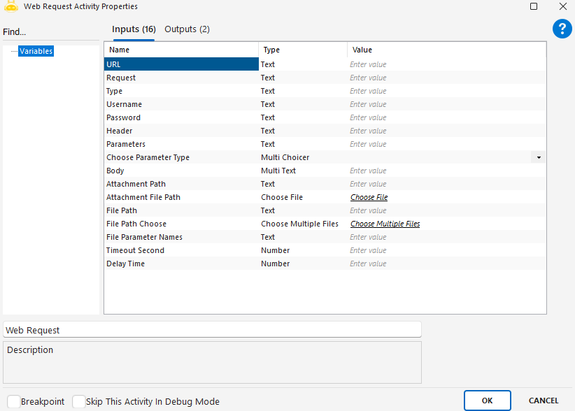 - File Path: Request’e eklenecek bir veya birden fazla dosyanın tam dosya yoludur.Noktalı virgül (;) ile birden fazla dosya girilebilir.Örnek: “C:\Dosyalar\rapor.pdf;C:\Dosyalar\ek1.xlsx”